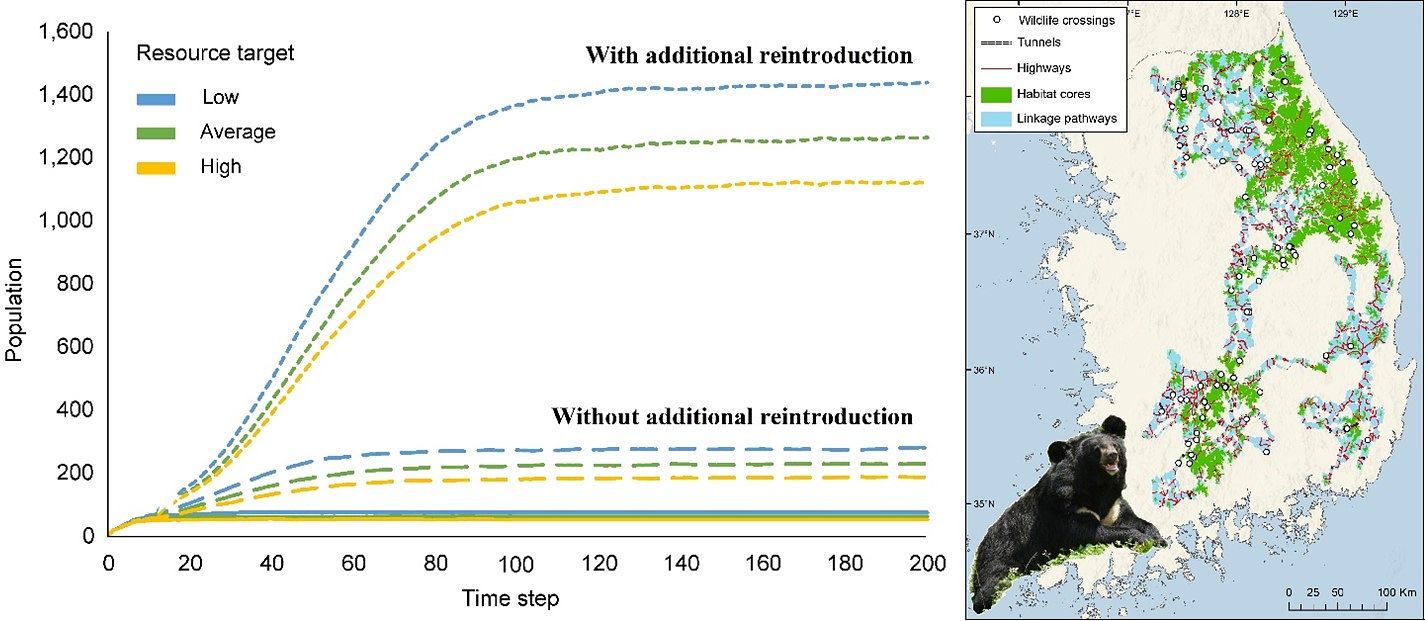 I have also collaborated with officials from the Korea National Park Service on a population model of reintroduced Asiatic black bears (Ursus thibetanus) in Jiri Mountain National Park utilizing HexSim. While the initial goal of this project was to determine the carrying capacity of the national park, I expanded the study to simulate the recolonization of bears across the country with and without an additional reintroduction, concluding that a second reintroduction is needed for full restoration of the species in South Korea.